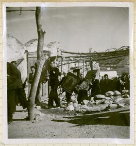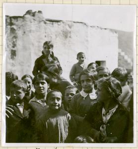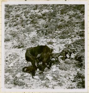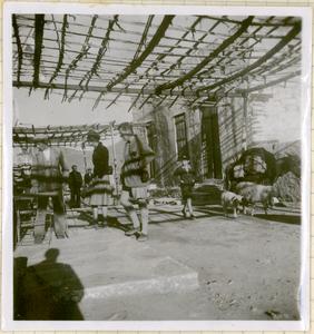 Outside, [in town square] being shown something on a table. A boy, a sheep and a lamb are walking past. Can also see the shadow of the photographer [Vincent Desborough].