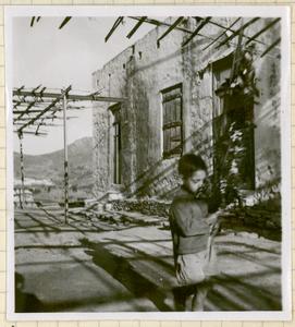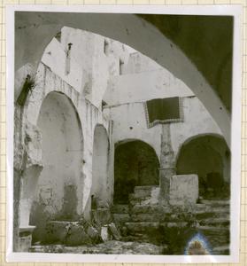 View of a cobbled street, white building, archway, steps on the outside of the building, and a boy walking in the street.