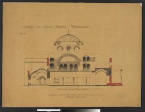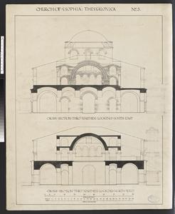 Longitudinal section. The drawing is entitled:'Church of Saint Sophia Thessalonica', No 5. it is labelled: 'Longitudinal Section'. Further annotation in pencil and ink survives. W.S. George (1906-1915/1907-1909?) has contributed to the drawings of this church.