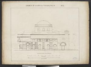 North-east elevation. This is a preliminary drawing. It is entitled:'Church of S. Sophia Thessalonica', No 8. It is labelled:'North-East Elevation'. Further annotation in pencil survives. W.S. George (1906-1915/1907-1909?) has contributed to the drawings of this church.