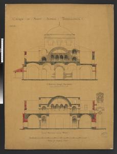 Transverse section looking south-east (top) - Transverse section looking north-west (bottom) with parts of the walling. A sketch of the longitudinal section of the church surives on the reverse. This is a preliminary drawing. It is entitled: 'Church of S. Sophia Thessalonica' No.5. It is labelled: 'Cross Section Through Narthex Looking South-East' and 'Cross Section Through Narthex Looking North-West'. Further annotation in pencil survives. W.S. George (1906-1915/1907-1909?) has contributed to the drawings of this church.On the reverse: A cancelled Section of the Church. This drawing was possibly part of the 1936 Exbhitiion at the Royal Academy as panel 528 in the catalogue