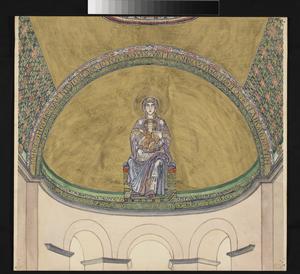 Apse mosaic - Enthroned Virgin with Child. The mosaic replaced an iconoclastic cross probably in the 11th c. The drawing forms part of a series: No 1 is inscribed in gold in the lower left-hand corner. It is initialed (W.H.) and dated (1908) also in gold in the lower right-hand corner.