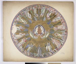 Dome - The Ascension (detail). The mosaic decoration in the dome is dated to the late 9th c. The drawing forms part of a series: No 3 is inscribed in gold in the lower left-hand corner. It is initialed (W.H.) and dated (1908) also in gold in the lower right-hand corner.