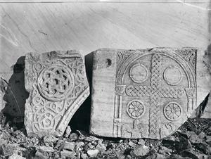 Relief marble closure slab (on the right) - Fragment of marble relief icon frame (on the left).Now in Byzantine Museum Athens. Further annotation in pencil survives at the back of the photograph.