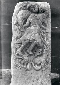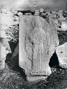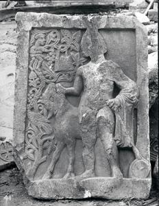 Relief marble slab with mythological theme (a young man leading a antelope) and floral motifs.Now in Byzantine Museum Athens. Further annotation in pencil survives at the back of the photograph.