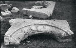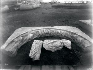 Marble tomb archivolt with relief decoration (fragment).Now in Byzantine Museum Athens. Further annotation in pencil survives at the back of the photograph.