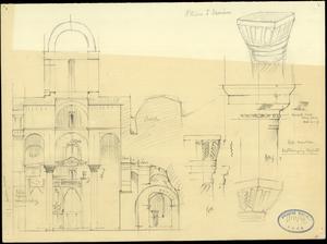 Transverse section, Parts of architectural members (capitals, columns). This is a preliminary drawing. The words 'Athens S Saviour' are inscribed in the top right-hand corner. Further annotation in pencil survives. Various sketches in pencil (a cross section, sketches of columns) survive at the back.
