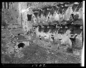 Part of a collection of images from the travels of Hasluck and Woodward to Rhodes, Telmessos, Attaleia [Adalia], Perge, Sillyon, and Aspendos in 1909. The original description in the SPHS register reads: "Aspendus: theatre, gallery behind upper seats".