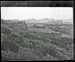 Part of a collection of images from Hasluck's travels in the Peloponnese, probably in 1908. The original description in the SPHS register reads: "Bay of Navarino. Forms, with care a panorama". Linked with SPHS 6238.
