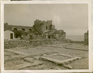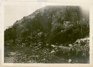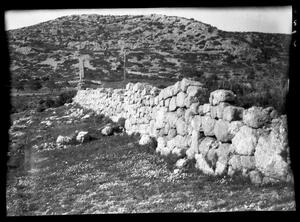Part of a collection of images from Hasluck's travels to Samos, Patmos, Leros, Didyma, Miletus, Priene, Scala Nuova in 1912. The original description in the SPHS register reads: "Samos: Tigani, walls of the Greek city".