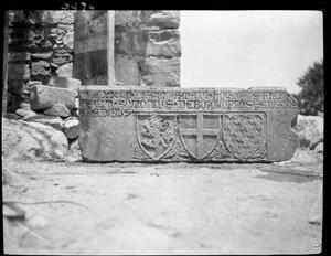 An image from a group of images taken by F.W. Hasluck when investigated the 'Latin Monuments' on the island of Chios from 1907 to 1909. Original description in the SPHS register reads: "Chios: inscribed stone with coat of arms from S. Claira".