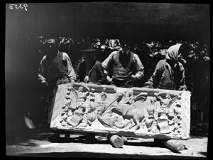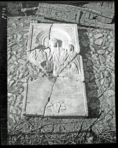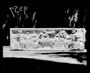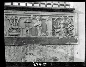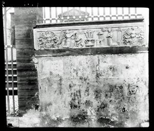 An image from a group of images taken by F.W. Hasluck when investigated the 'Latin Monuments' on the island of Chios from 1907 to 1909. Original description in the SPHS register reads: "Chios: sepulchral relief in Bishop's garden (BSA xvi. pl. X.28)".