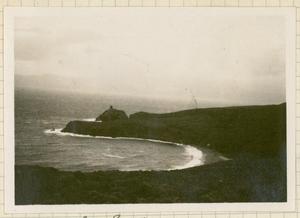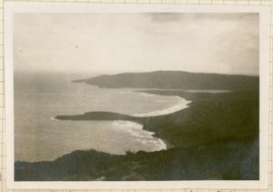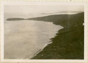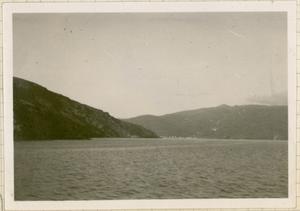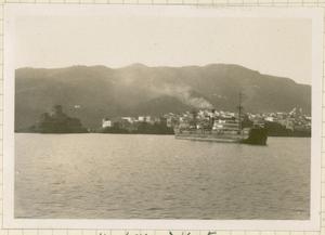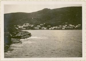 [Taken from a boat travelling to Ándros island]. Includes a ship in the harbour.