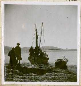 [PEN/2/2/4/303], Photograph of sailing boat and smaller boat moored to rocks at Apano Kouphonisi [Koufonísion, Nisída], Saturday, April 01, 1939