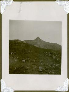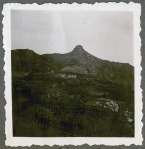 [PEN/7/2/6/466], Photograph of a mountain peak with buildings in the foreground captioned “Apano Kapetaniana and Kophinos” [Kapetanianá and Kófinas, Óros], Crete, 10 Apr 1936