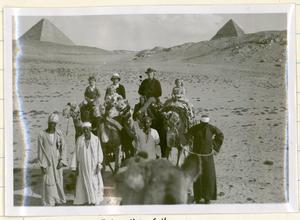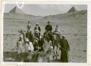 Group photograph of [Robin Hammond], [Molly Hammond holding her younger daughter “J.H”], “H.G.”, and “S.H.” [older daughter of Martin and Molly Hammond] on camels, with guides, in front of Pyramids, Giza, Egypt