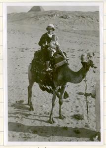 Photograph of [Molly Hammond] and “J.H.” [the Hammond’s youngest daughter] sitting in a camel, Giza, Egypt
