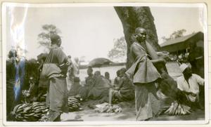[PEN/2/2/5/332], Photograph (taken by A. J. Smalley) of a group of local women and men sitting under a tree with bunches of fruit and vegetables, and some standing nearby, in Arusha, Tanzania, 23-24 Feb 1938