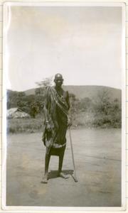 [PEN/2/2/5/203], Photograph of a Masai [Maasai] tribesman [by the side of the road next to the group’s broken-down car, between Arusha and the Serengeti Plain, Tanzania], 18-19 Feb 1938