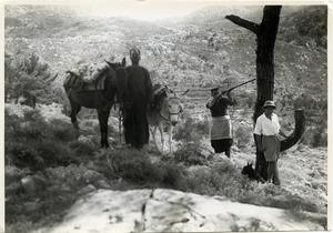 The group is composed of 2 [local] men with horses (one pointing a gun into the air) and an [archaeologist] with a dog. [Location not identified].