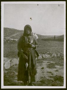A group of children, with a woman standing behind them and holding wool on a spindle.