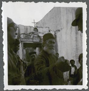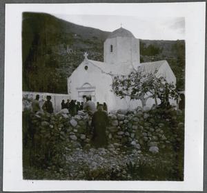 Photograph of “Koudouma Monastery, Acting Abbot” standing outside stone wall, the church is behind with a crowd gathered outside it [Moni Koudouma], Crete