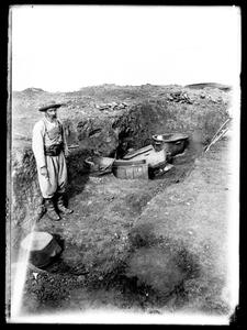 Part of a group of images from the British School at Athens excavations at Palaikastro, Crete in the 1902-1905. The original description in the SPHS negative register reads: "Palaikastro". Image shows larnakes burials excavation, possibly with W.L.H. Duckworth in the photo.