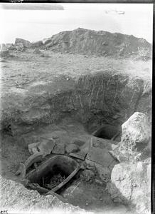 Part of a group of images from the British School at Athens excavations at Palaikastro, Crete in the 1902-1905. The original description in the SPHS negative register reads: "Palaikastro: Larnax containing three skulls (BSA No.= P.K. 59)".