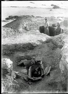 Part of a group of images from the British School at Athens excavations at Palaikastro, Crete in the 1902-1905. The original description in the SPHS negative register reads: "Palaikastro: Larnax interments on cliff (BSA No.= P.K. 58)".