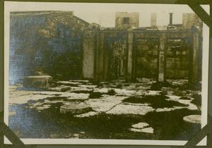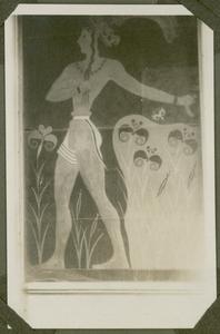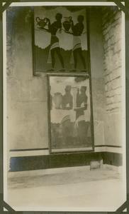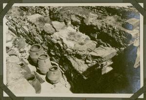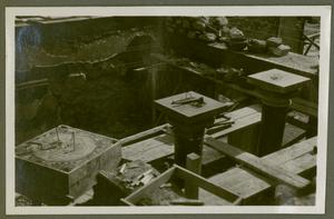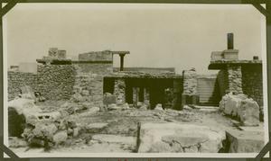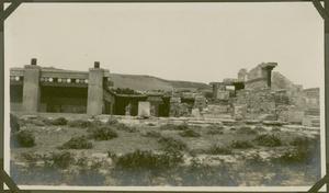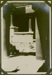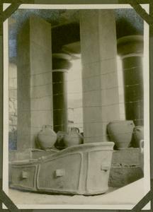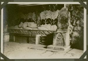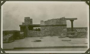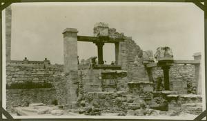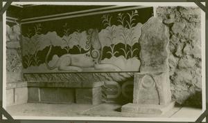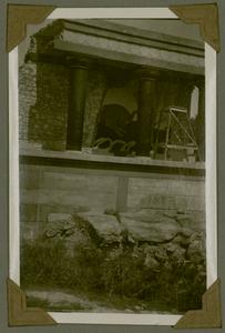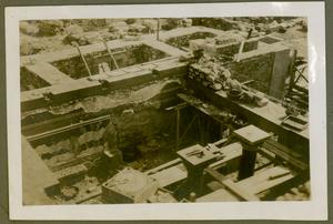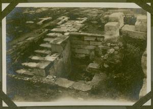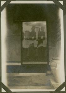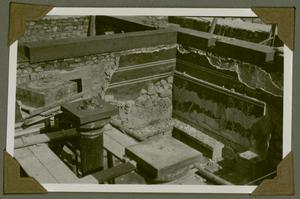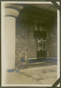Found during 1930 excavations. Side view, with altar piece placed on a wall.