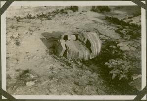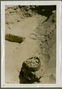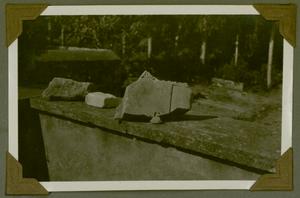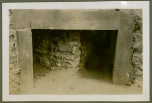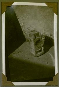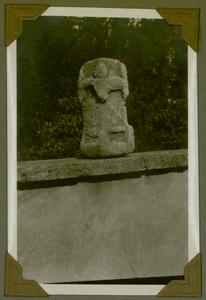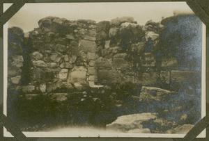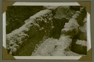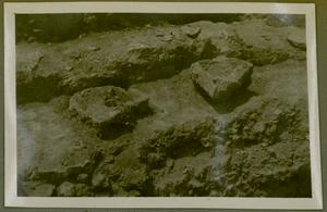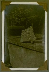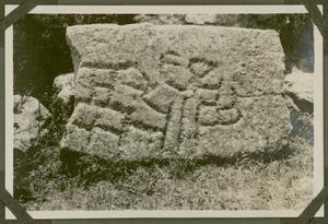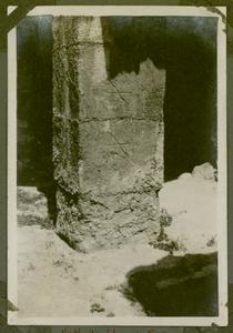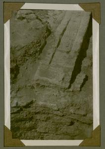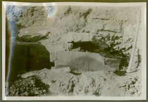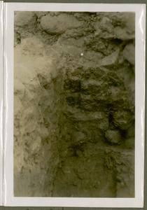 Found during 1930 excavations. Side view, piece of stone placed on a wall.