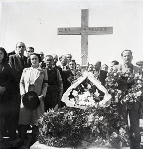 Shows Hilda Pendlebury and others standing by a wooden cross, with wreaths of flowers laid next to it.