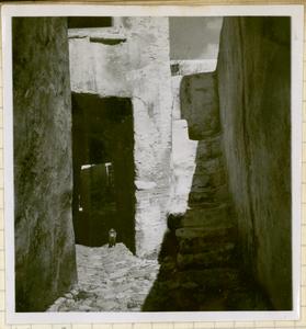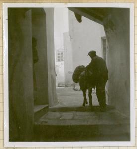 View through a covered path of a man with donkey (loaded with paniers), and a woman in a doorway.