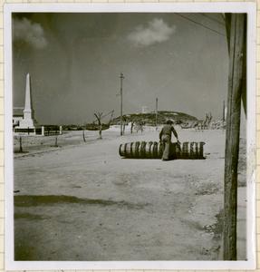 Scene of a man rolling baskets along a wide road by an obelisk monument, with Temple of Apollo in Palatia (Portara) in the background.