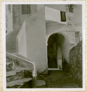 View of a cobbled street, white building, archway, steps on the outside of the building, and a boy walking in the street.